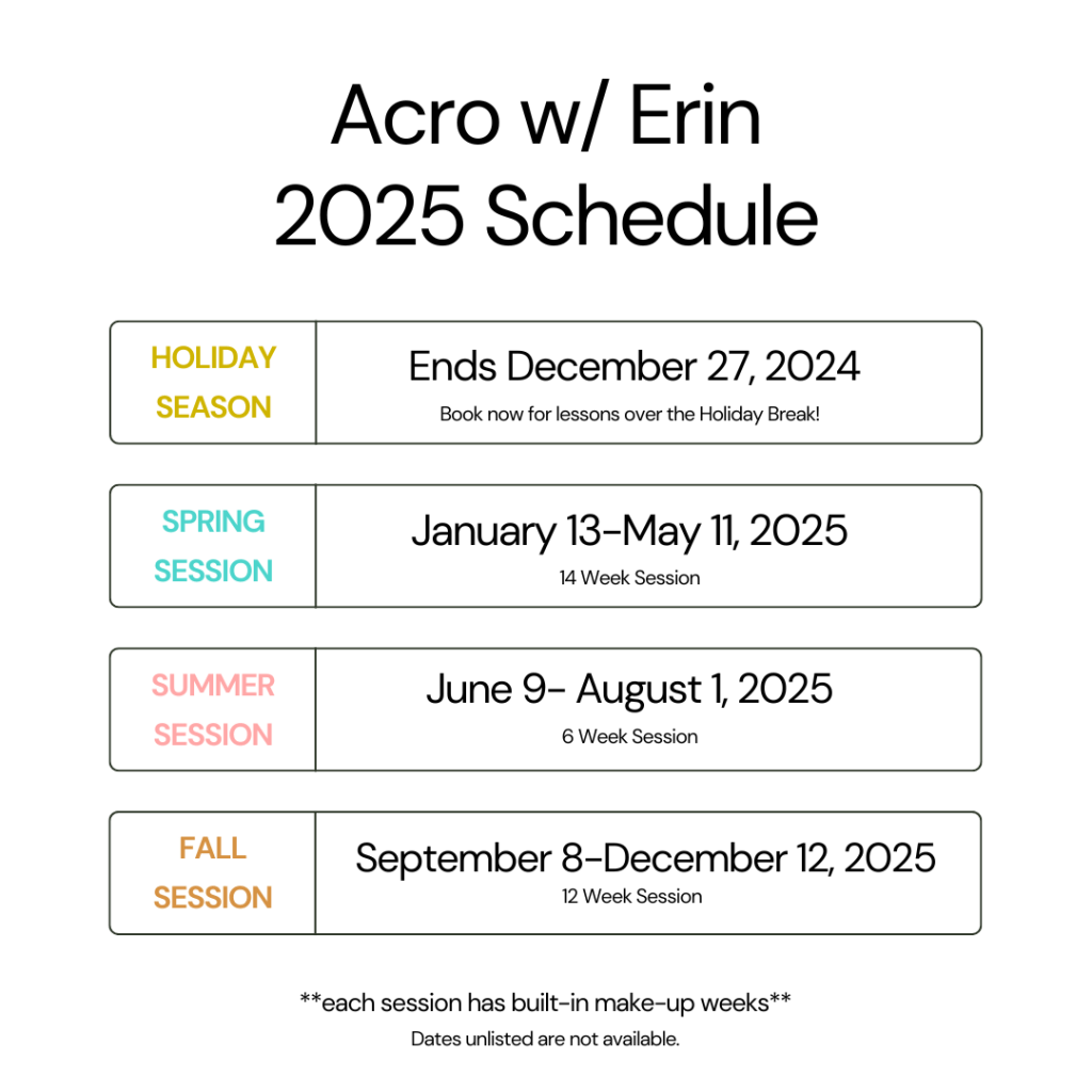 Whether your kiddo needs to clean up some advanced skills or is just getting started, one-on-one coaching will help them achieve their Acro goals.